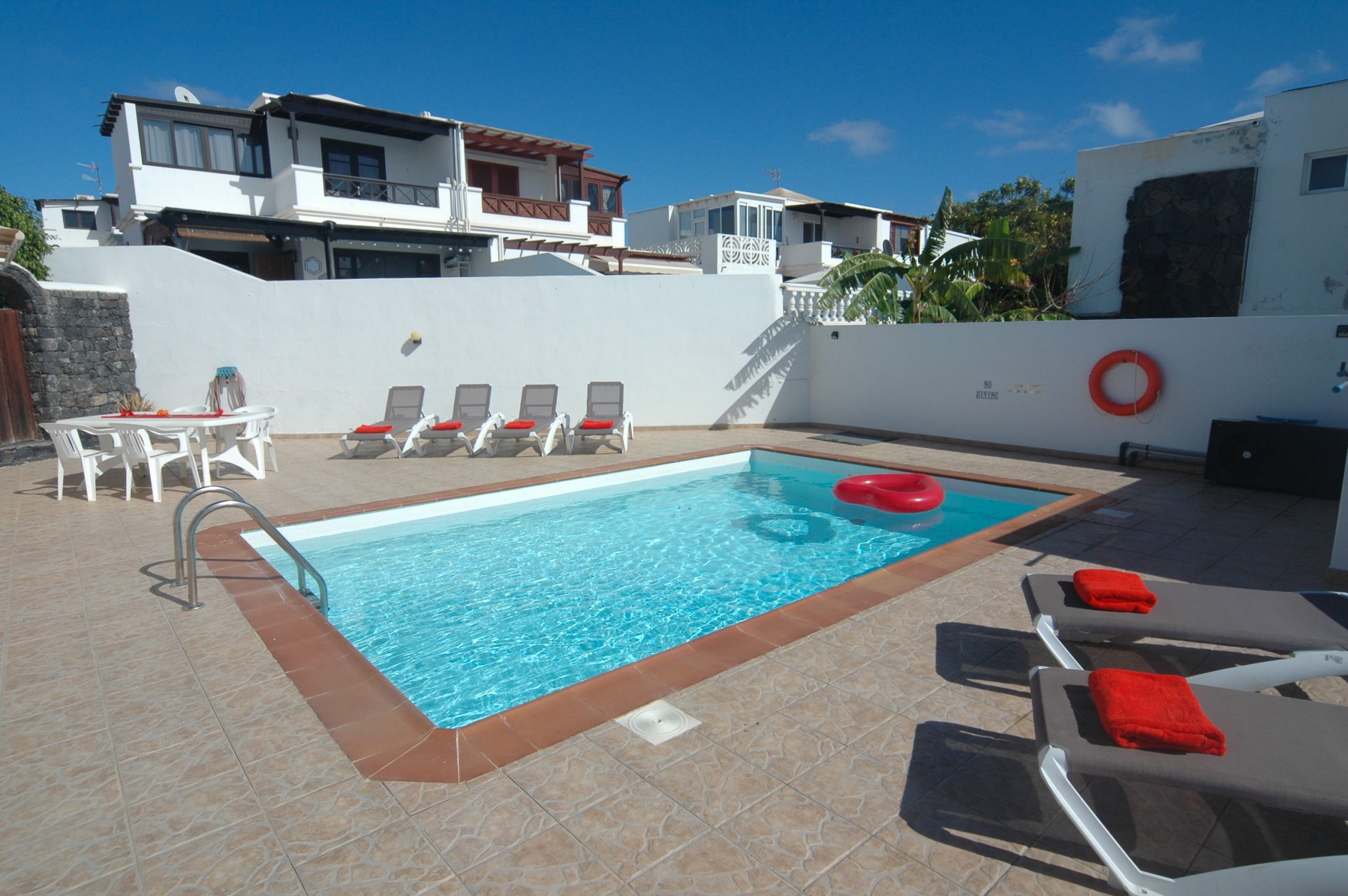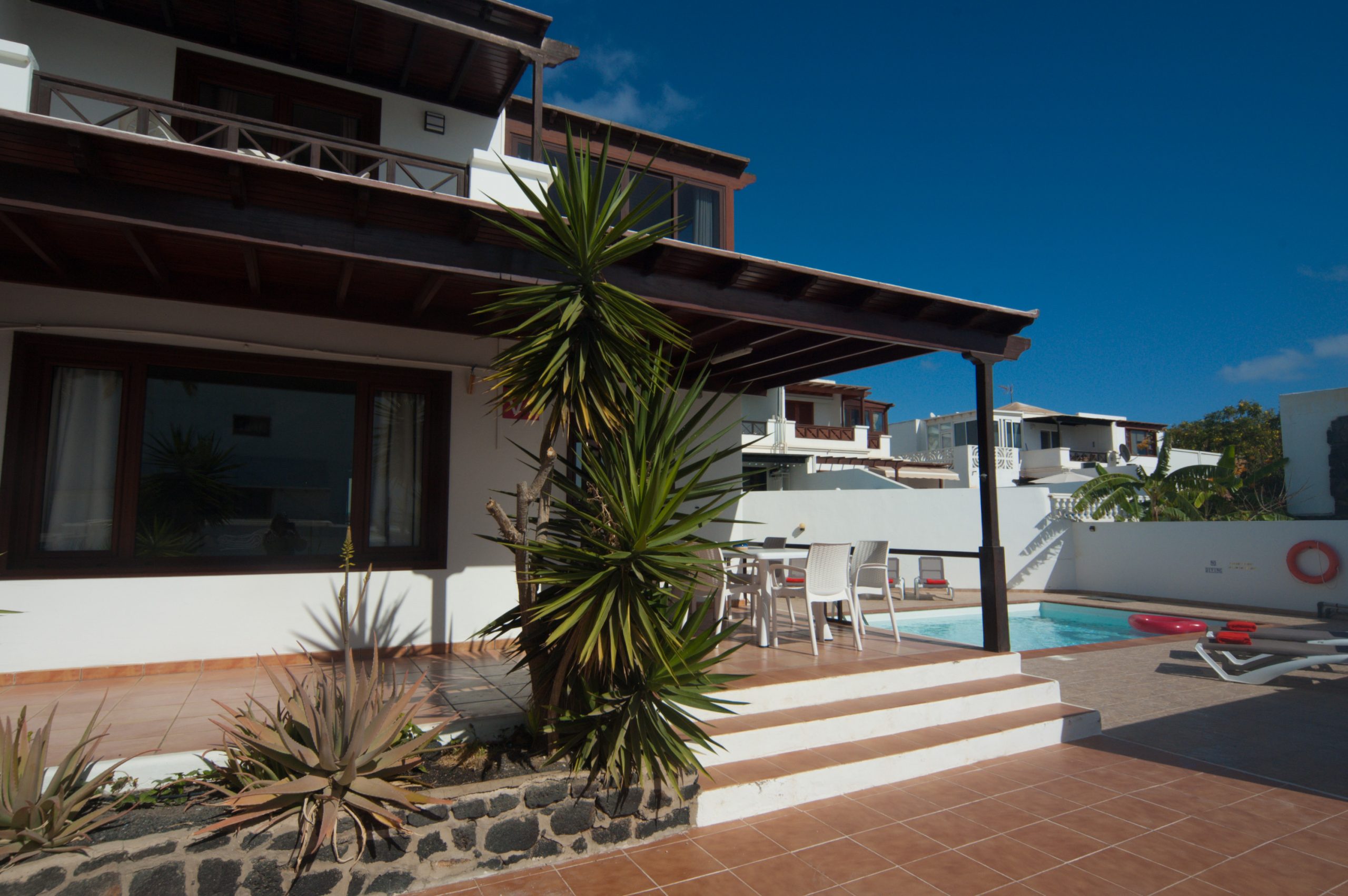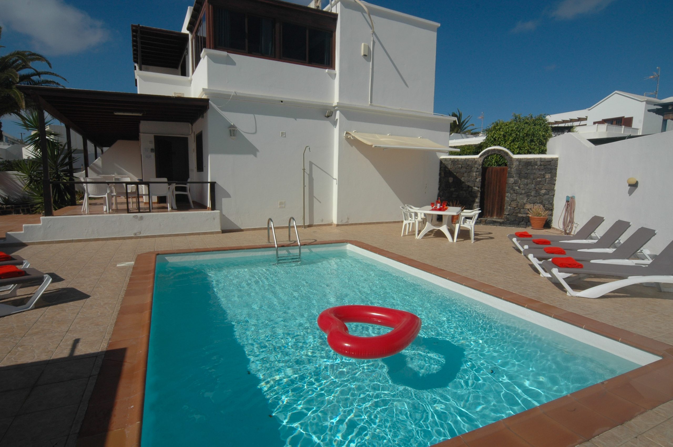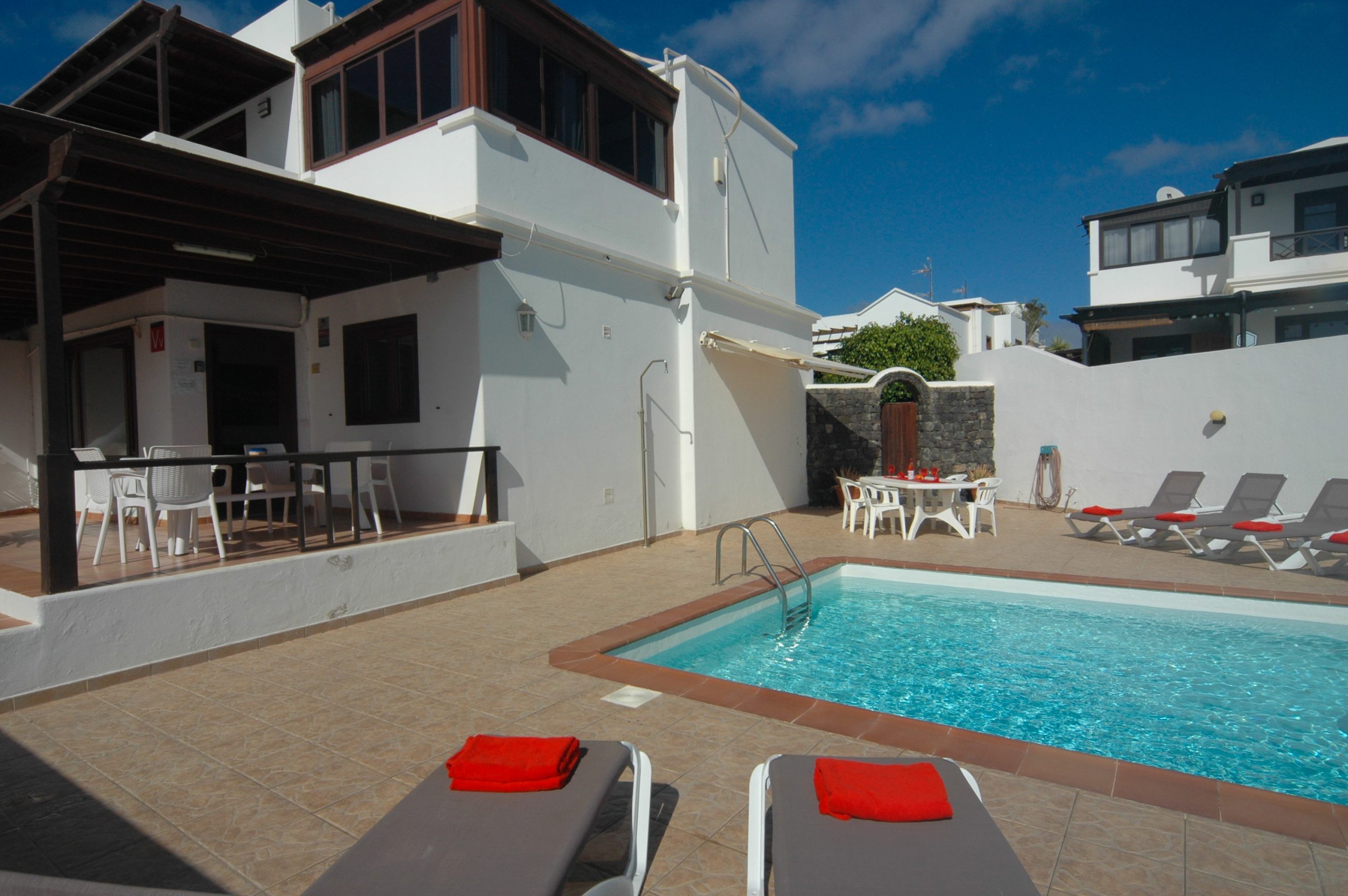 This spacious villa on two levels is one of two semi-detached properties located in a quiet, partly residential area of Puerto del Carmen and has a large private, heated swimming pool, with plenty of terrace space for sun-bathing. There is one twin bedroom and a shower room / toilet downstairs and another twin and one double bedroom and bathroom upstairs. The ground floor has a spacious lounge / dining room and a good sized, well equipped kitchen. The property has free wi-fi and internet television.