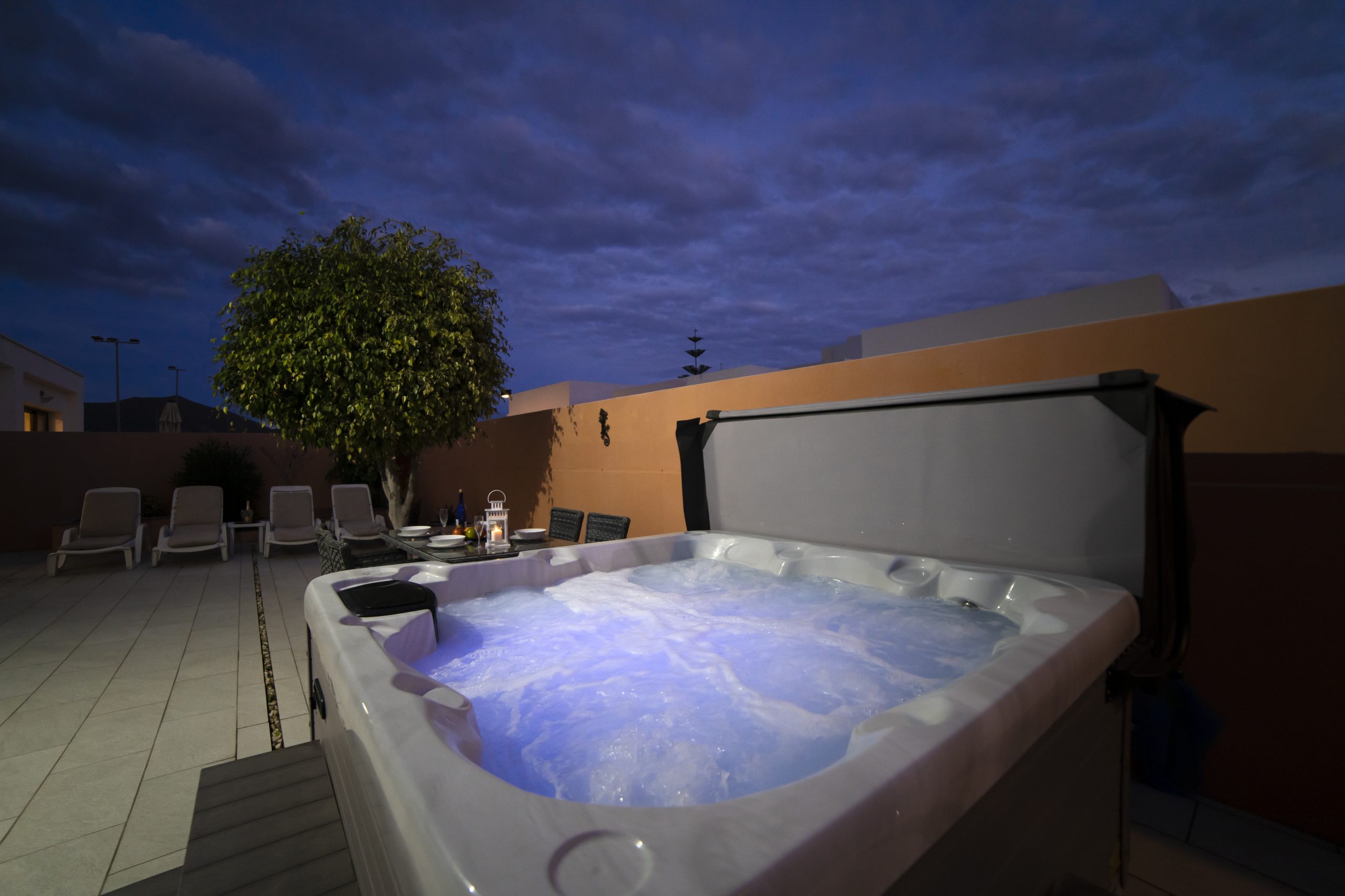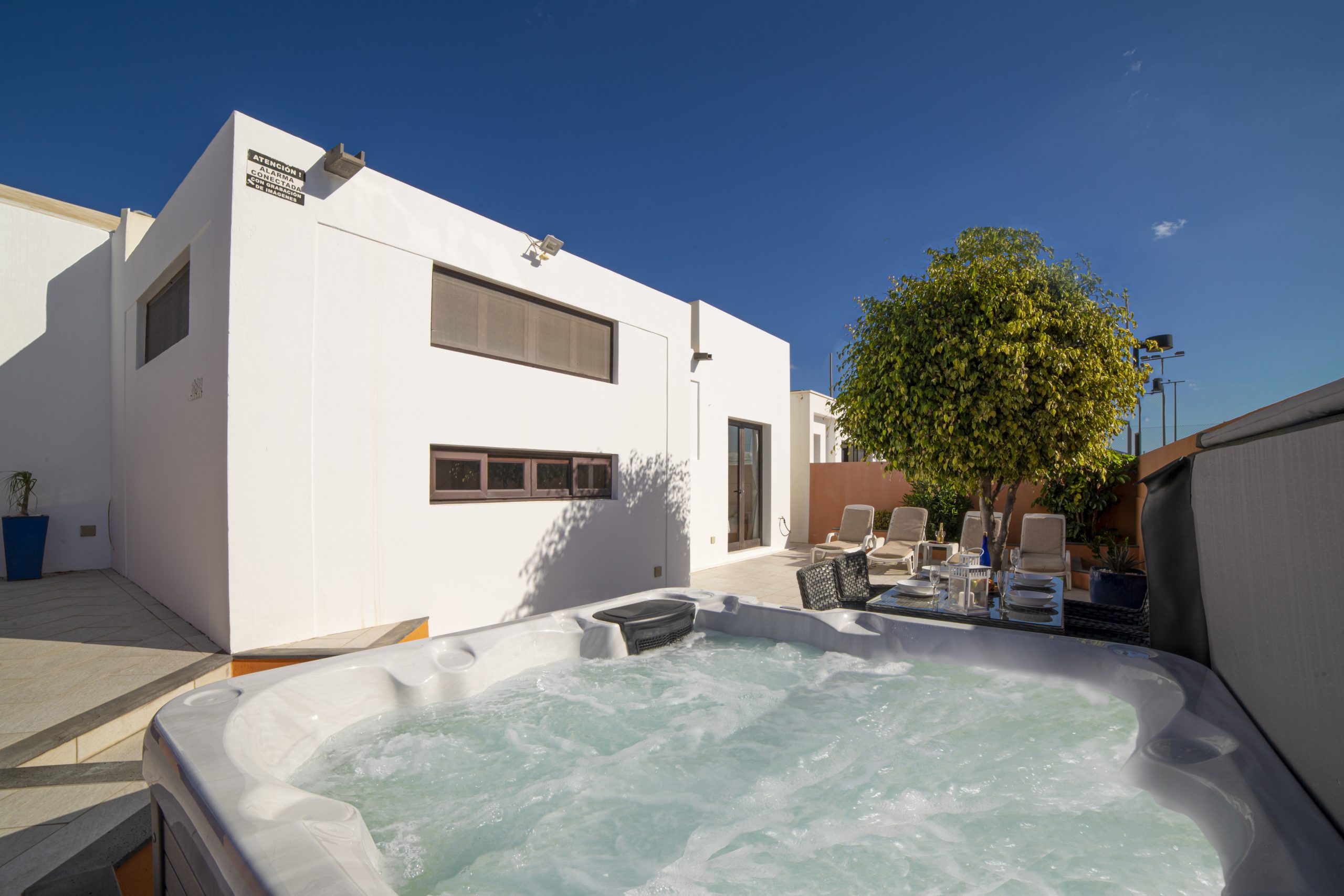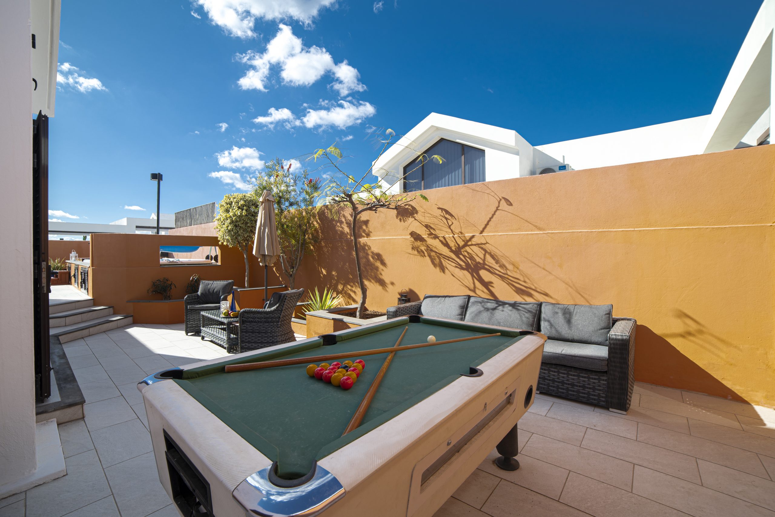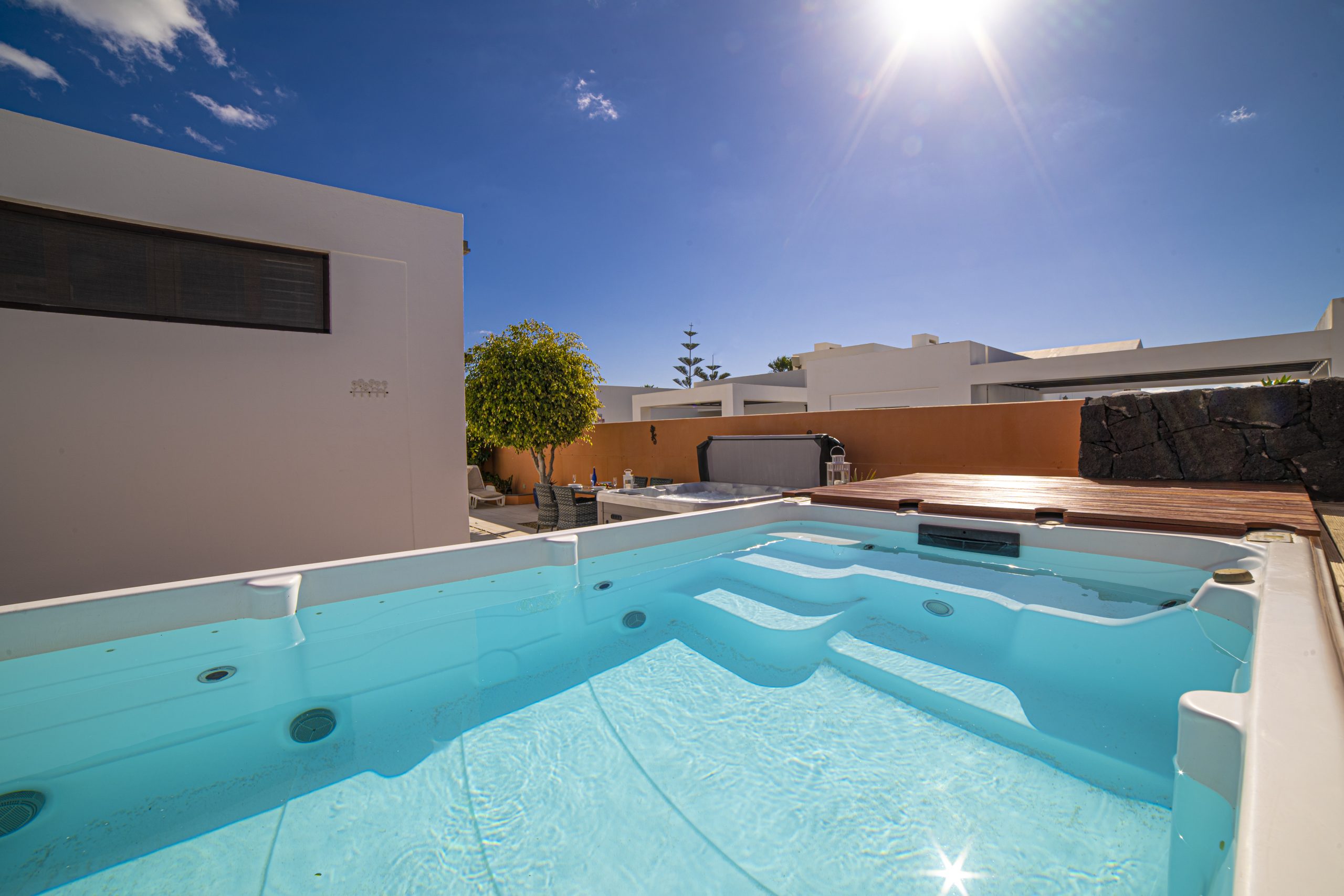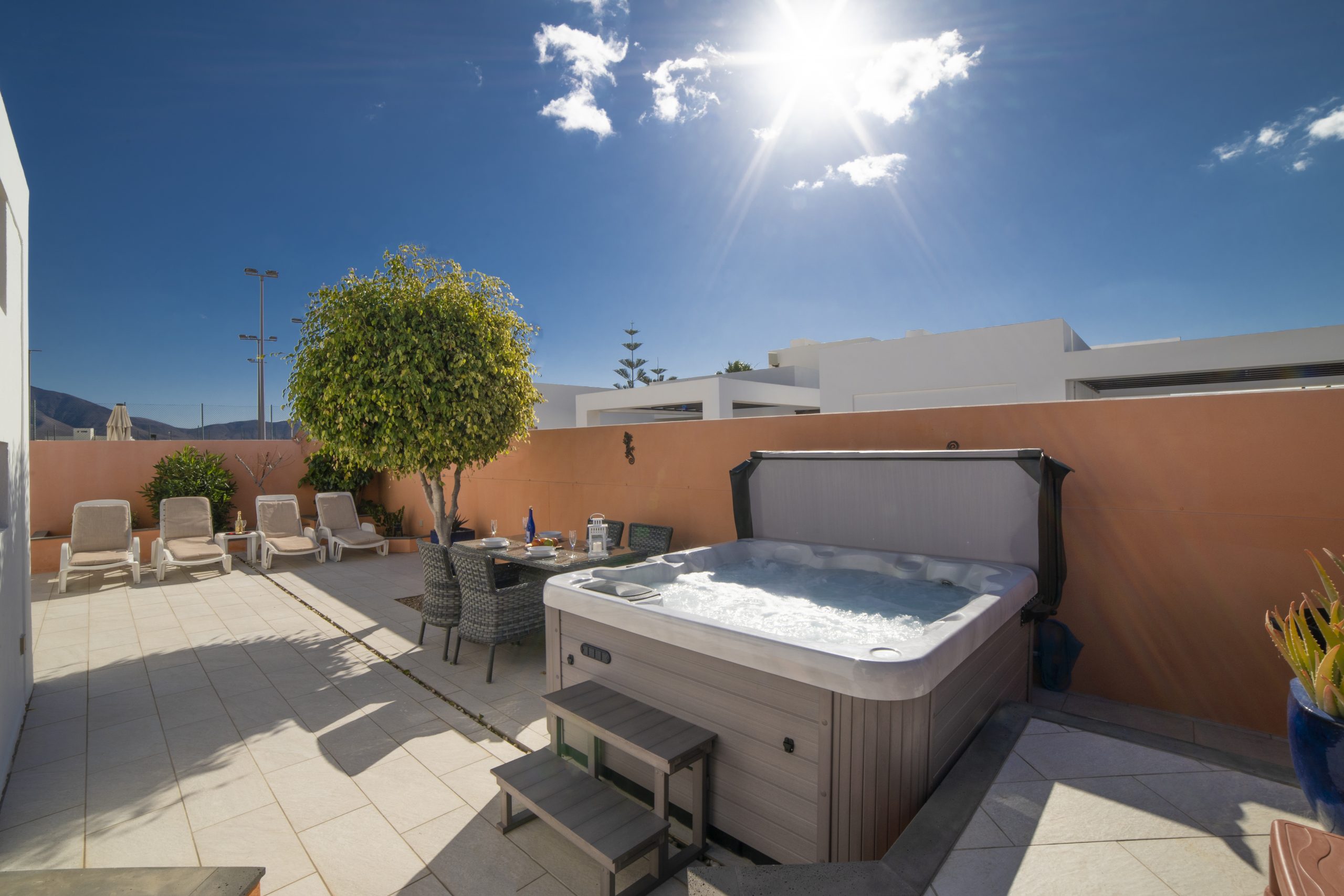 Modern and well furnished 2 bedroom villa in the Buganvilla area of Playa Blanca. This holiday rental has a unique resistance pool for keen swimmers, hot tub for relaxing, tennis/paddle court and pool table. The furnished outdoor areas are perfect for al fresco dining and soaking up the sun. There is 1 double bedroom with a four poster bed and a further bedroom with twin beds. A leisurely 25-minute walk from the beach and the heart of the seaside village. There, you can enjoy a variety of cafes and restaurants along the seafront promenade and in the elegant setting of Marina Rubicón. This bright and inviting villa features a fully equipped kitchen, 2 bedrooms, 2 bathrooms as well as absolute tranquility.The villa also as coin operated air conditioning & IPTV with UK channels