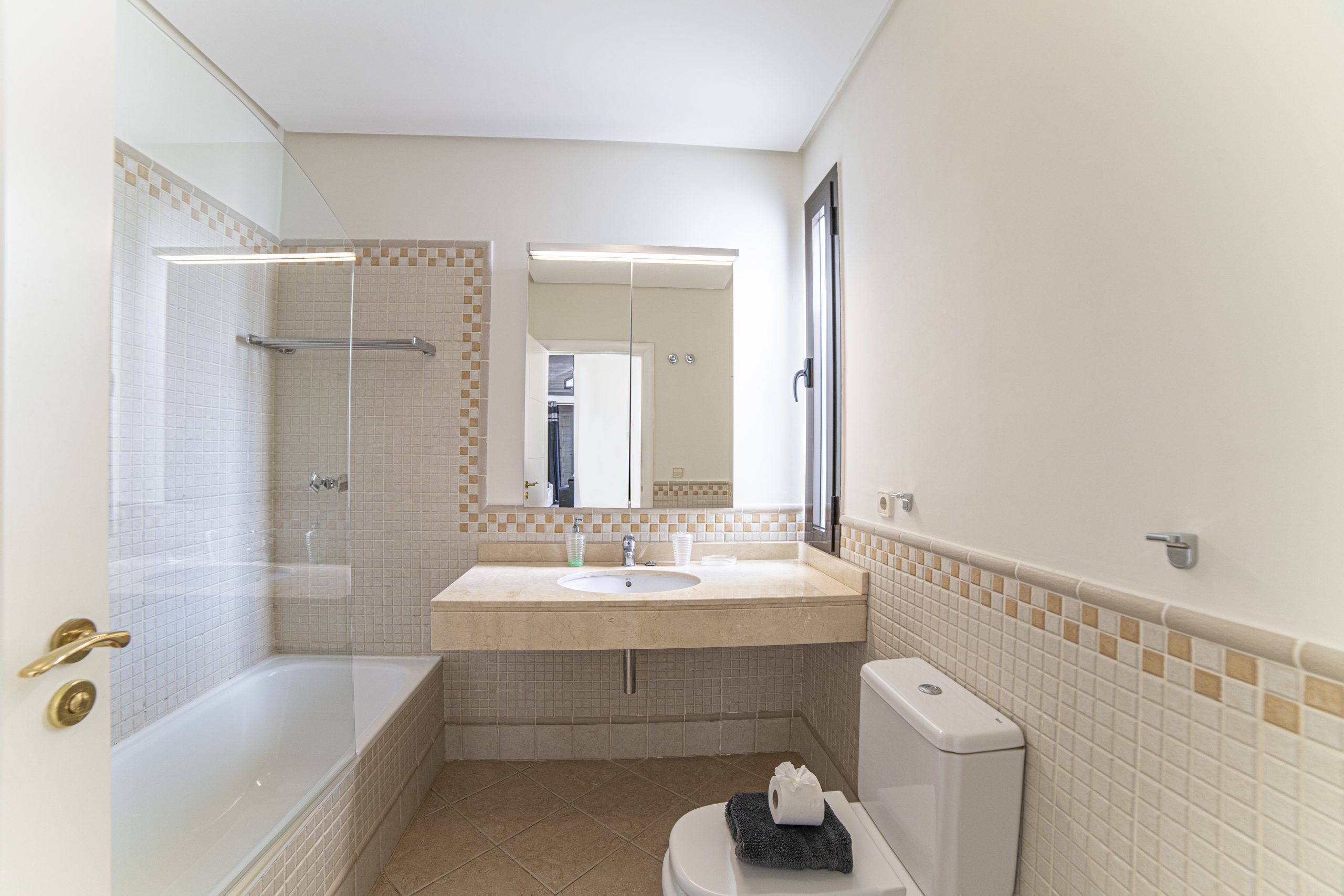 Patio doors from the living room lead out the pool area and hot tub with sunbeds and patio furniture. There are tennis/paddle court, a BBQ and shaded areas