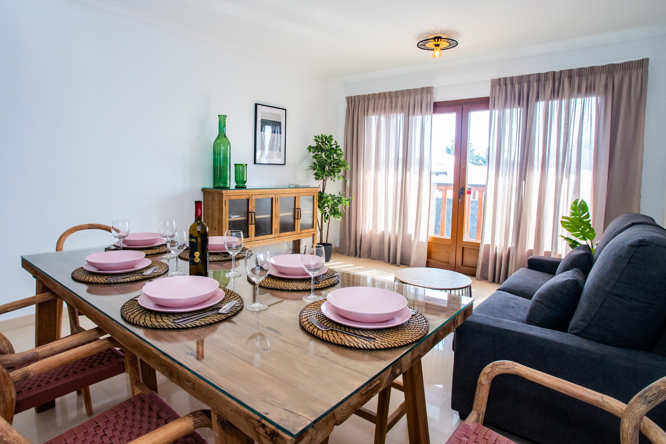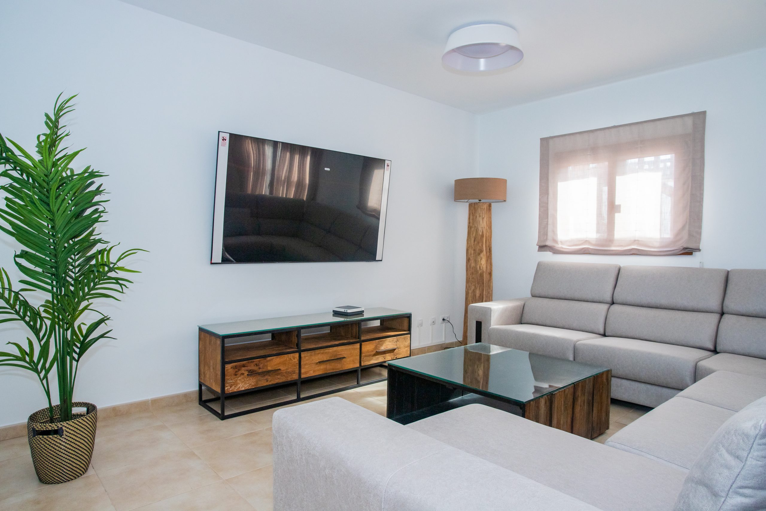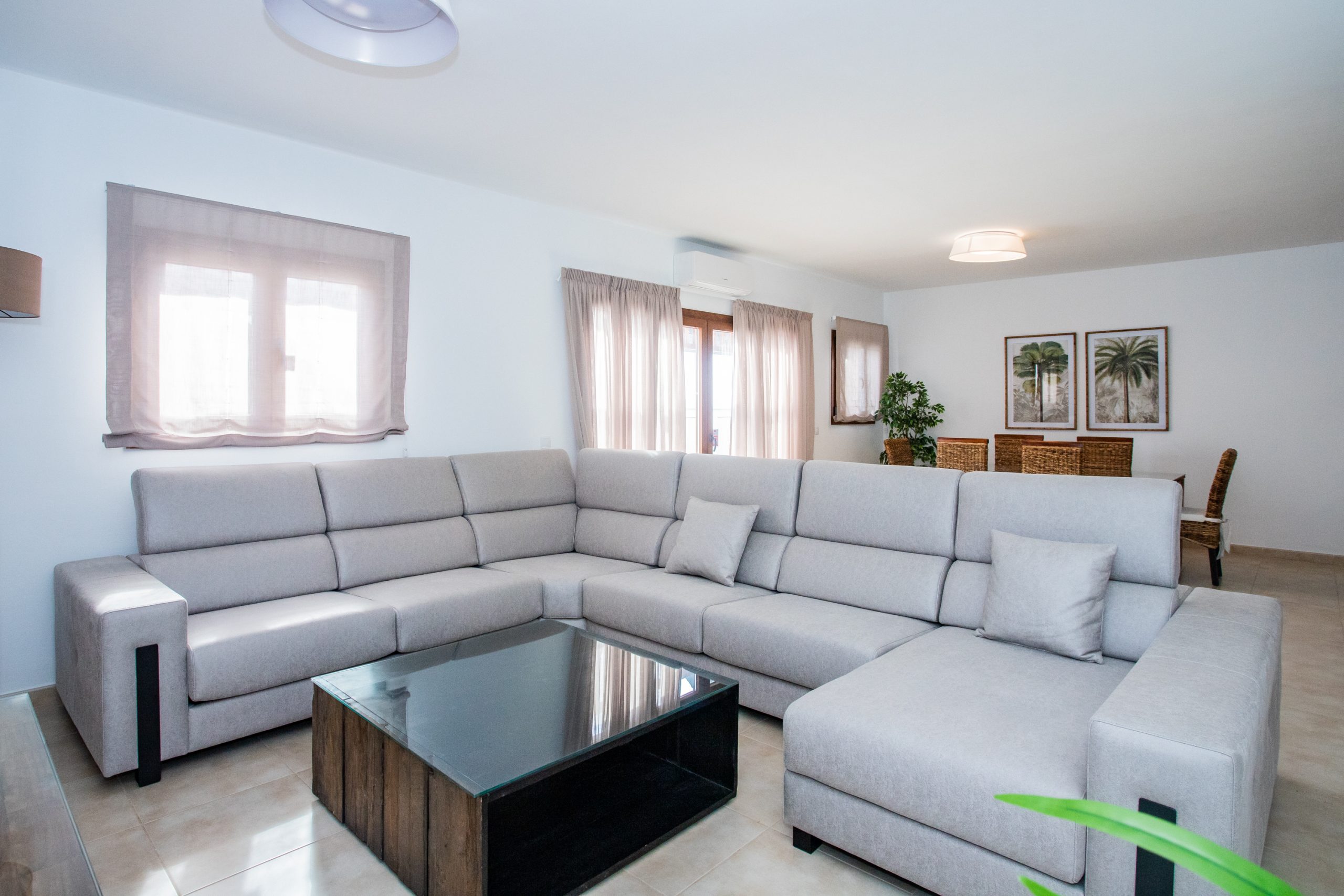 Spacious living area downstairs with comfortable sofas, Dining area with table & chairs, IPTV with UK channels & Wifi. There are patio doors to steps leading up to sun terrace.